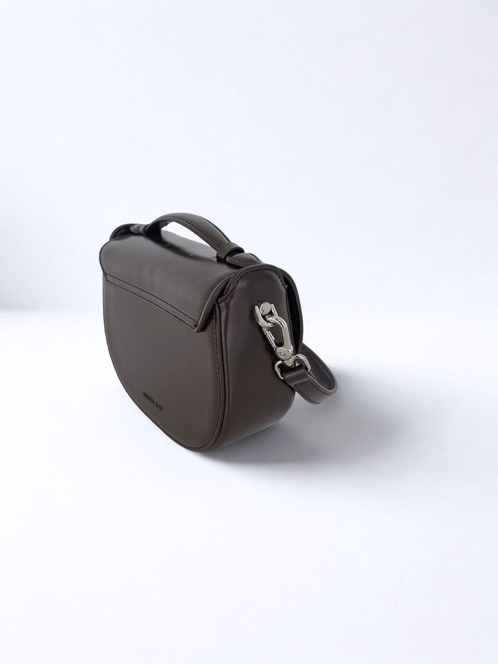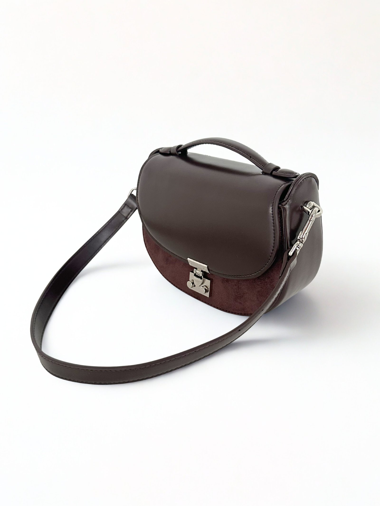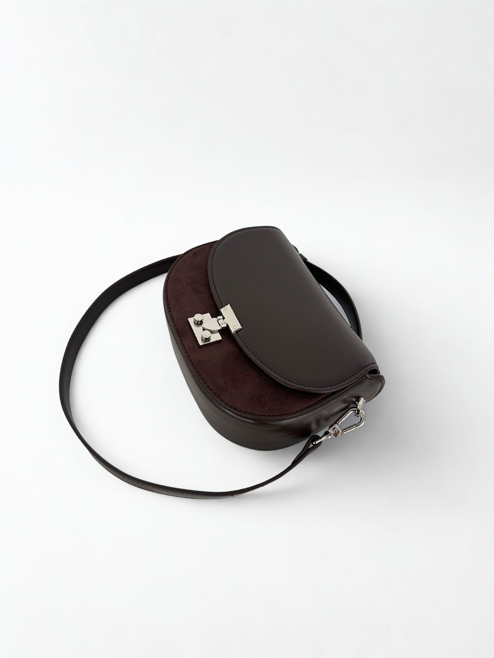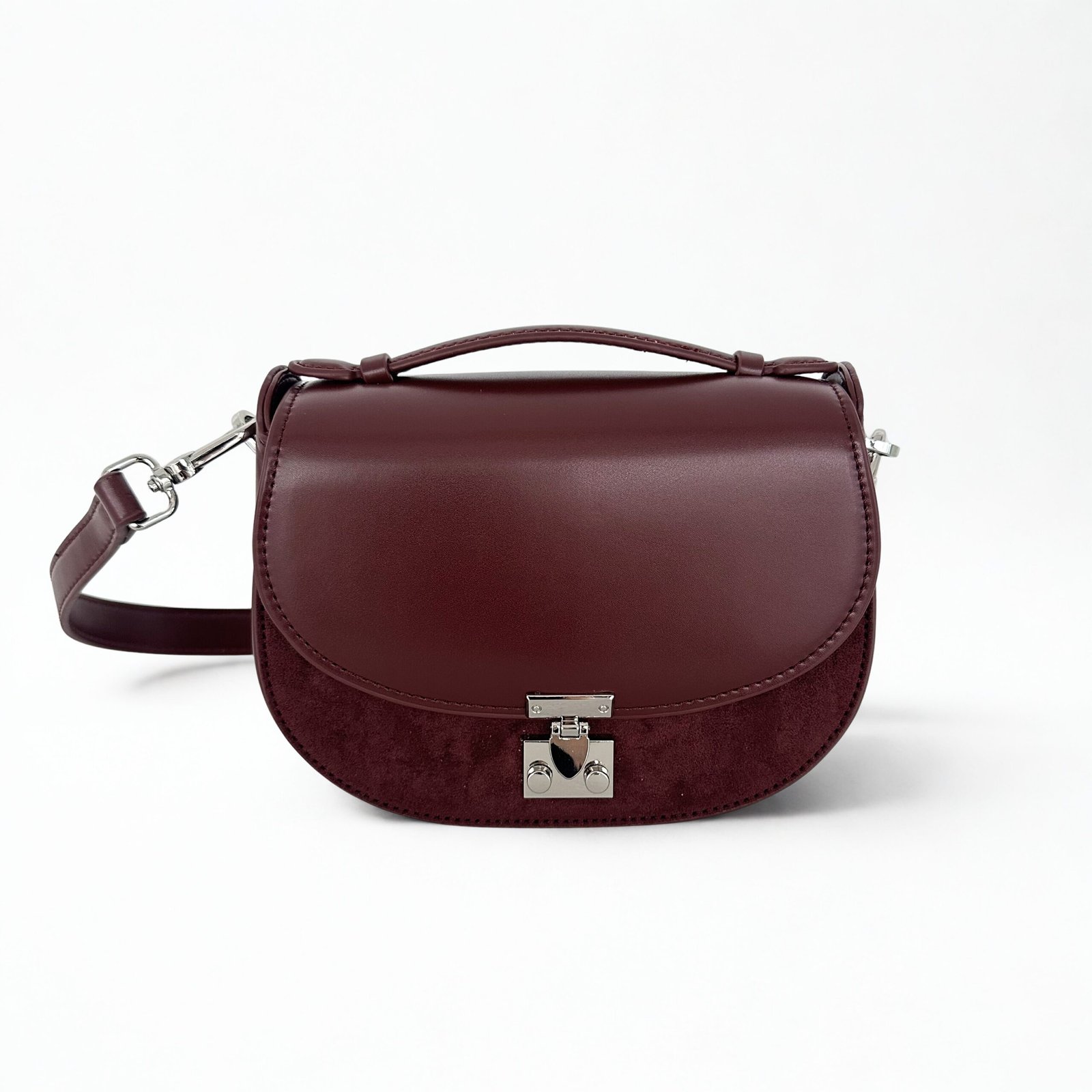 Structured half – moon shoulder bag in rich color with smooth finish, suede panel detail and silver clasp closure. Compact crossbody design with adjustable strap, perfect for day – to – night styling.