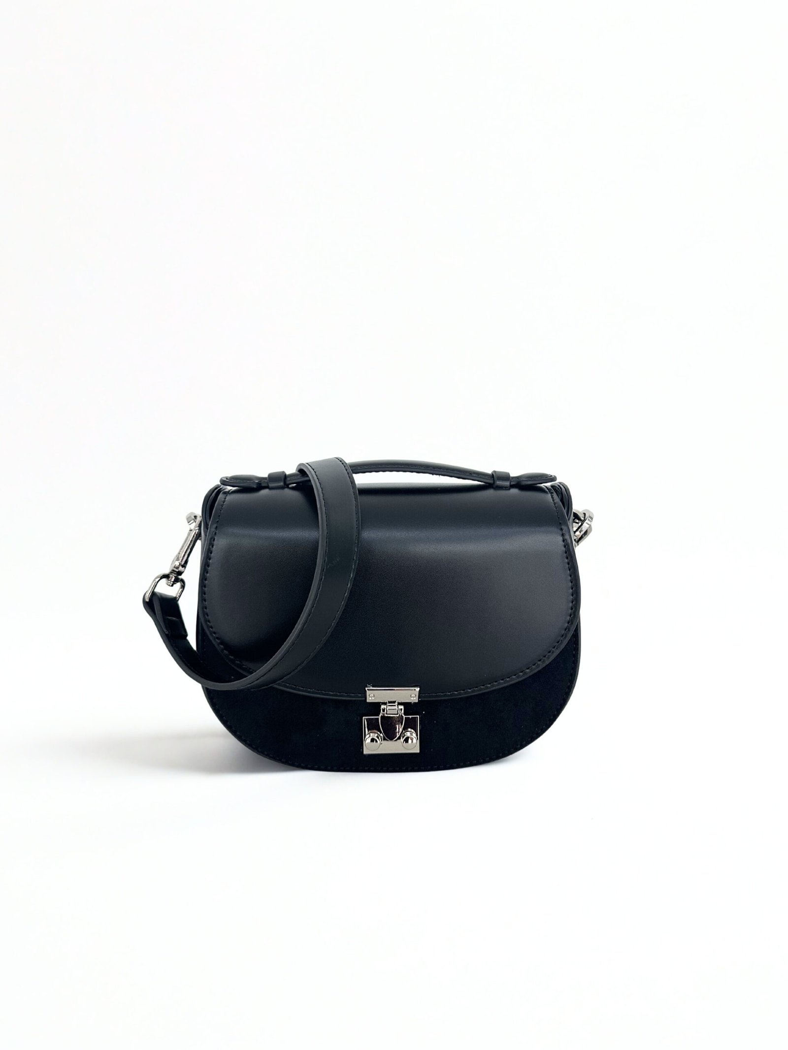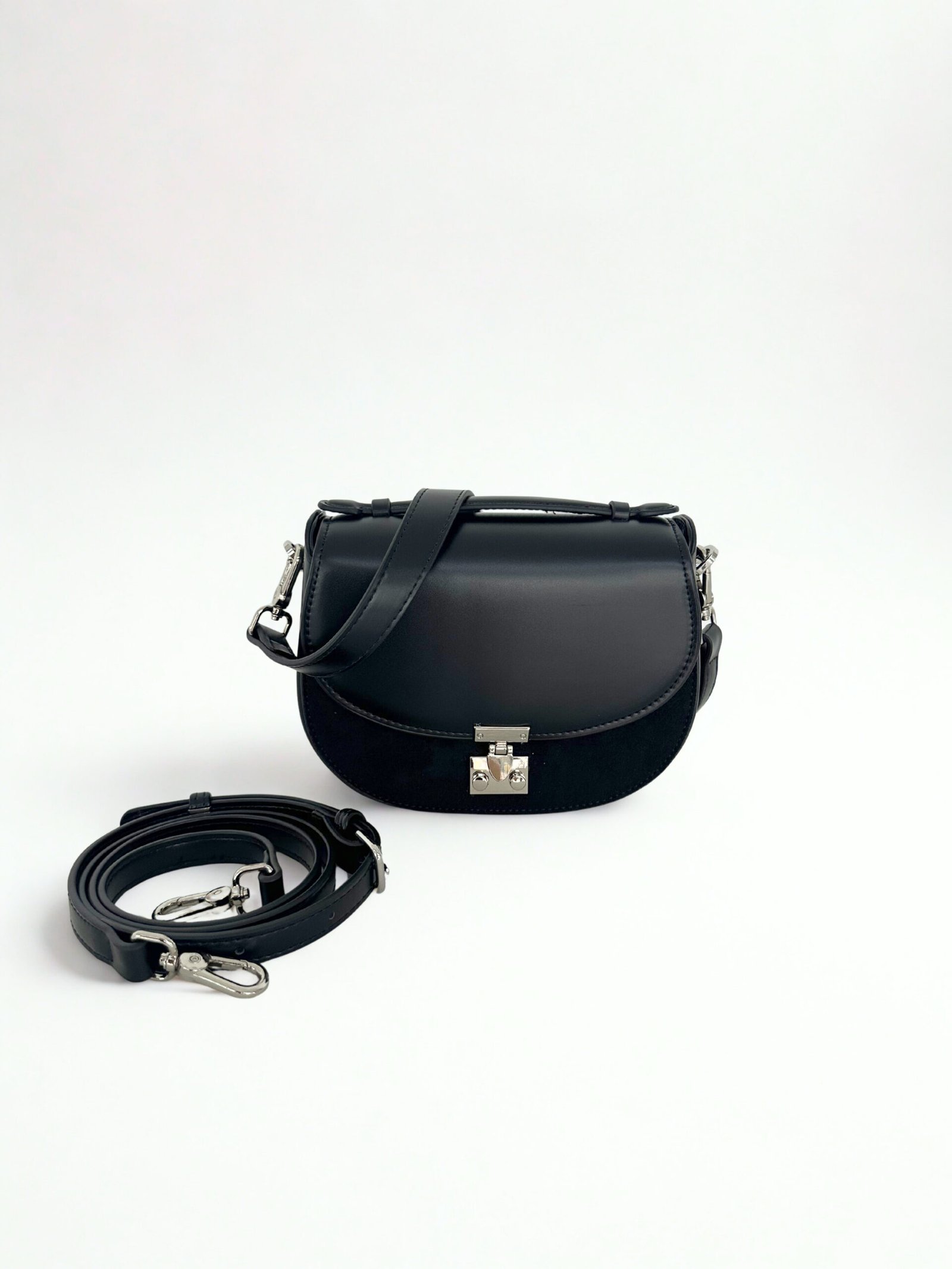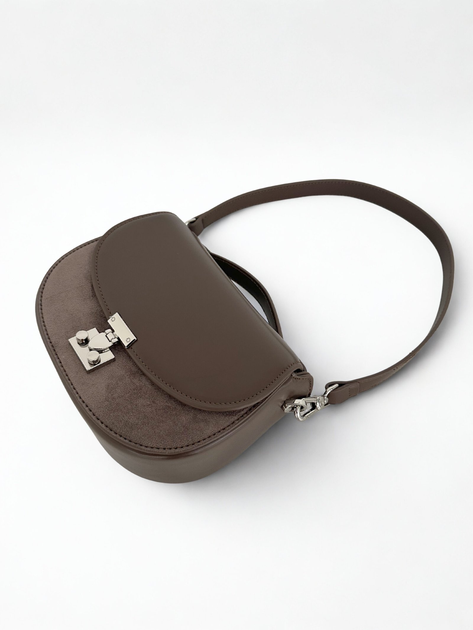 Elevate your everyday look with this structured half-moon shoulder bag, designed with a sleek curved silhouette and polished silver-tone clasp closure. Crafted with a smooth exterior and soft suede panel detailing, this compact crossbody bag blends modern minimalism with timeless elegance.